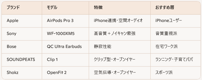 ランニングや通勤、在宅ワークまで幅広く活躍するワイヤレスイヤホン。特に40代パパ世代には「家族との時間を邪魔しない静音性」「仕事と趣味を両立できる多機能性」が重要です。ここでは最新モデルを比較します。