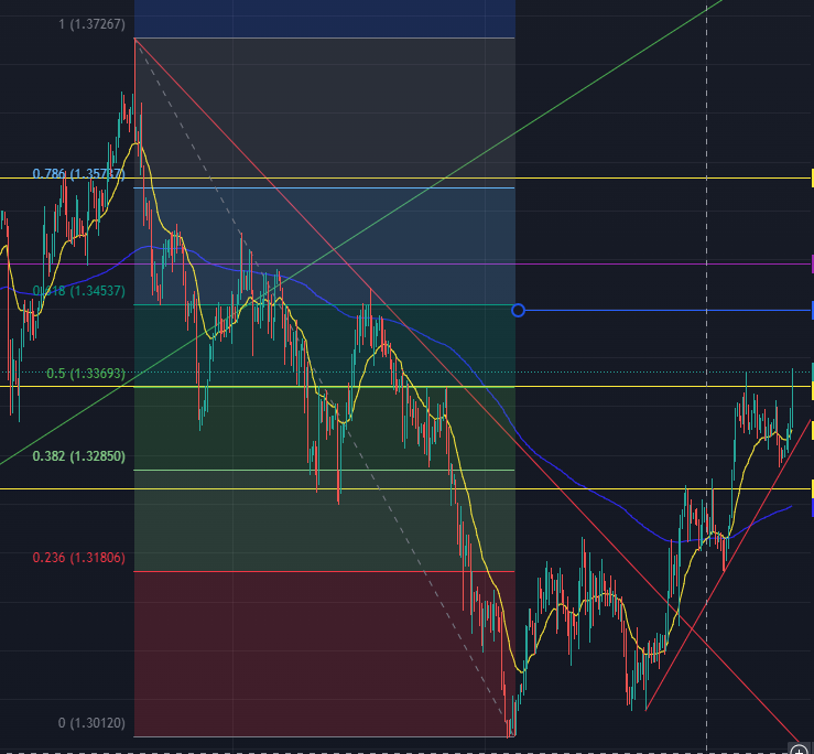 今日の狙い目はGBP/USDの4時間足。エリオット波動で今2波。戻すとしたら今来ている0.5とラインが重なる所が濃厚。でも簡単には入らない。赤の上昇ラインを下抜けたら3波分を取る。損切は勿論直近高値に設定しよう。