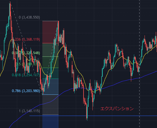 以下の画像は、フィボナッチ・リトレースメントやエクスパンションが実際のチャートでどう使われているかを示す例だよ: