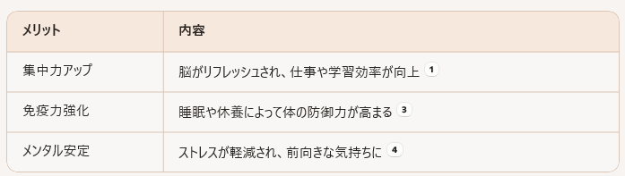 現代人は常に「がんばること」が美徳とされがち。でも実は、休息こそがパフォーマンスを最大化する鍵です。科学的にも、適切な休養は集中力・免疫力・モチベーションを高めることが証明されています。