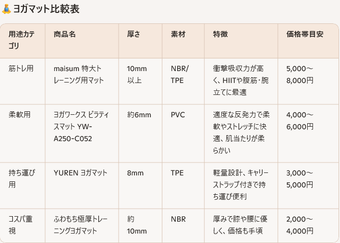 - 重さ: 天然ゴムは重いが安定、TPEは軽いがズレやすいことも。床との相性で選ぶ。